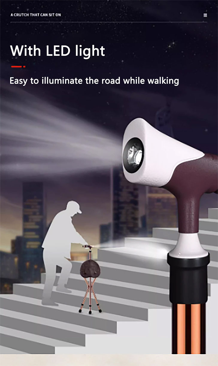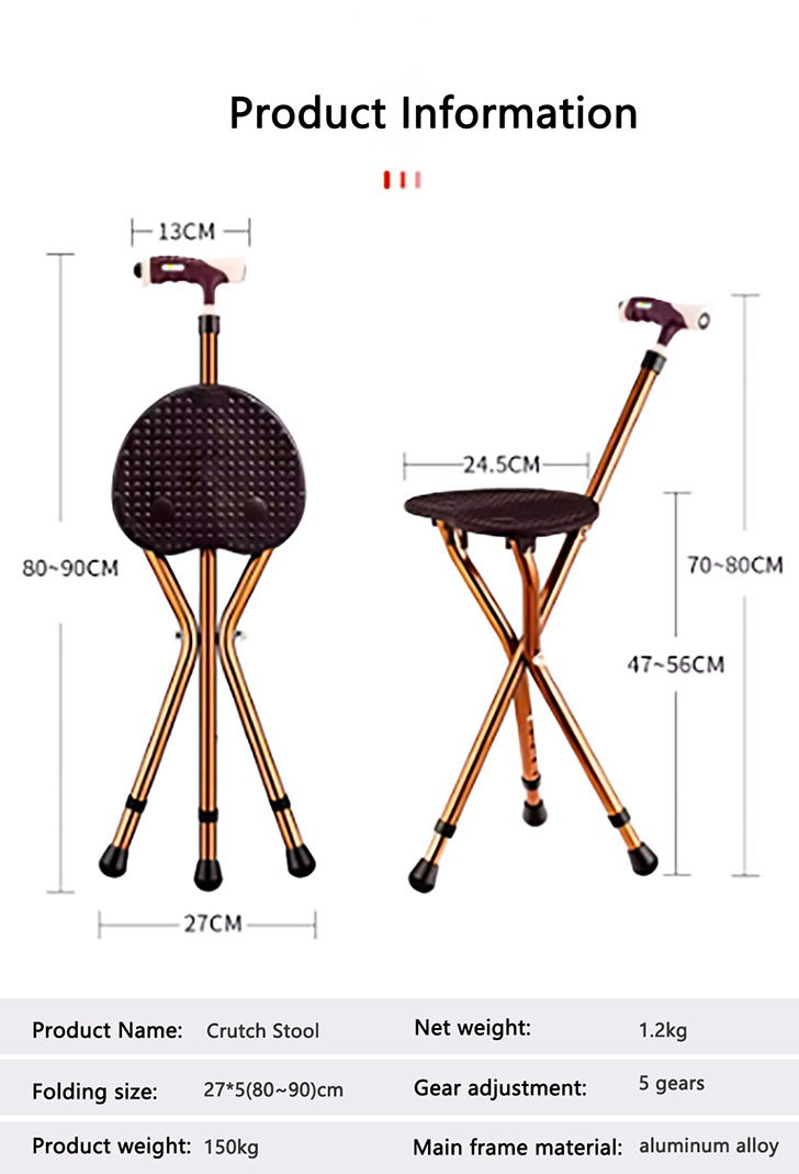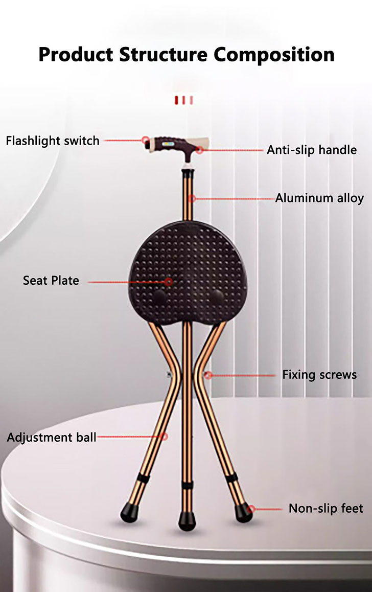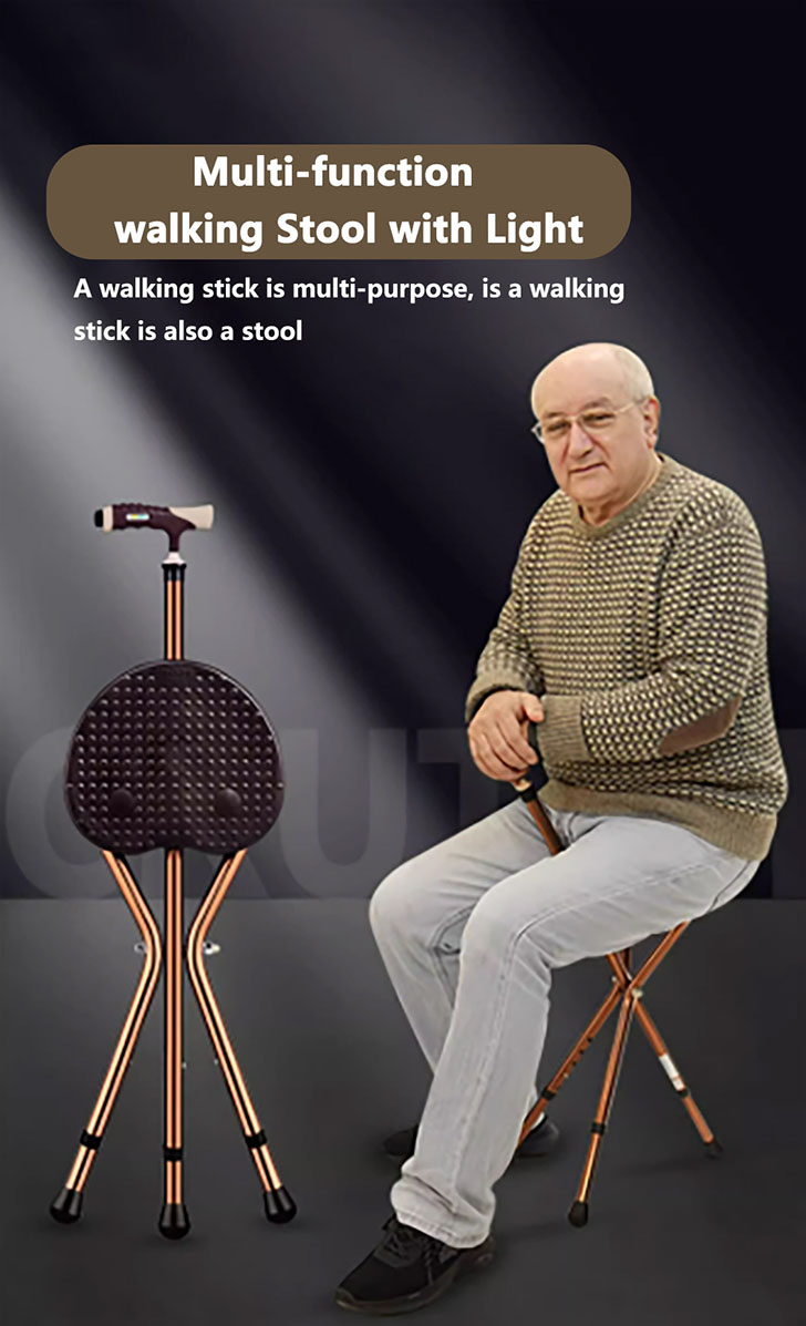 三腳手杖凳,兼具坐具功能,可作為行走輔具與臨時休息手杖