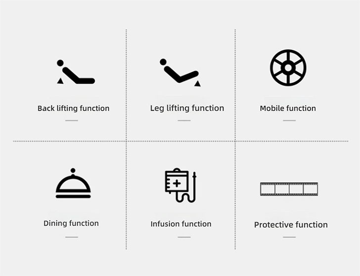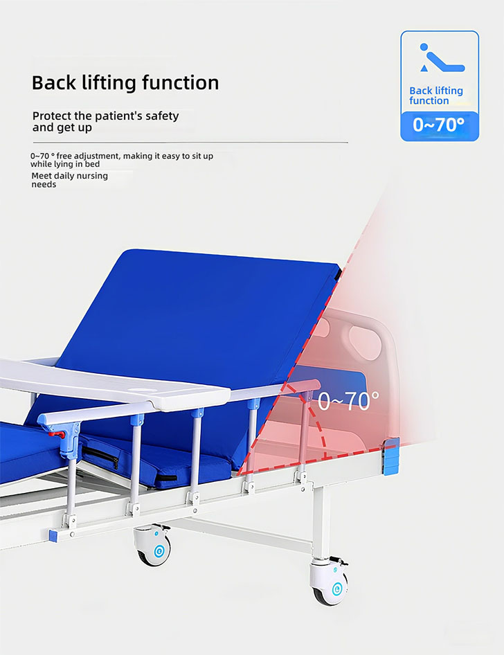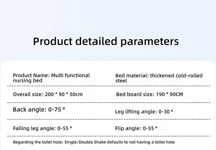 型號:YHF-HLC-D 整體尺寸:200*90*50公分;床板尺寸:190*90公分 背部傾斜角度:0-75度;腿部下放角度:0-55度 腿部抬升角度:0-30度;翻身角度:0-55度