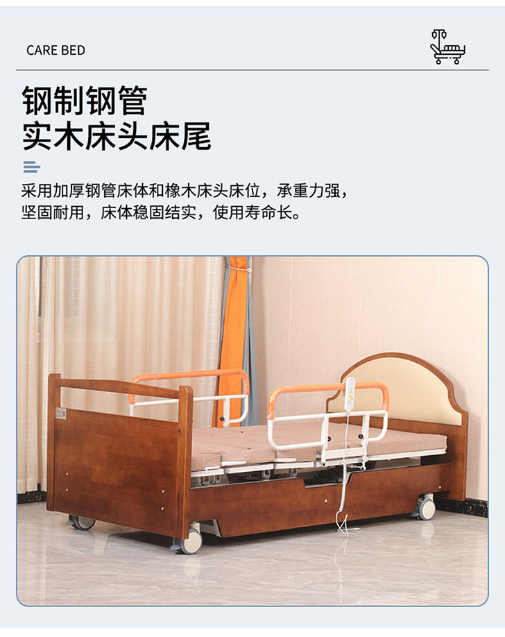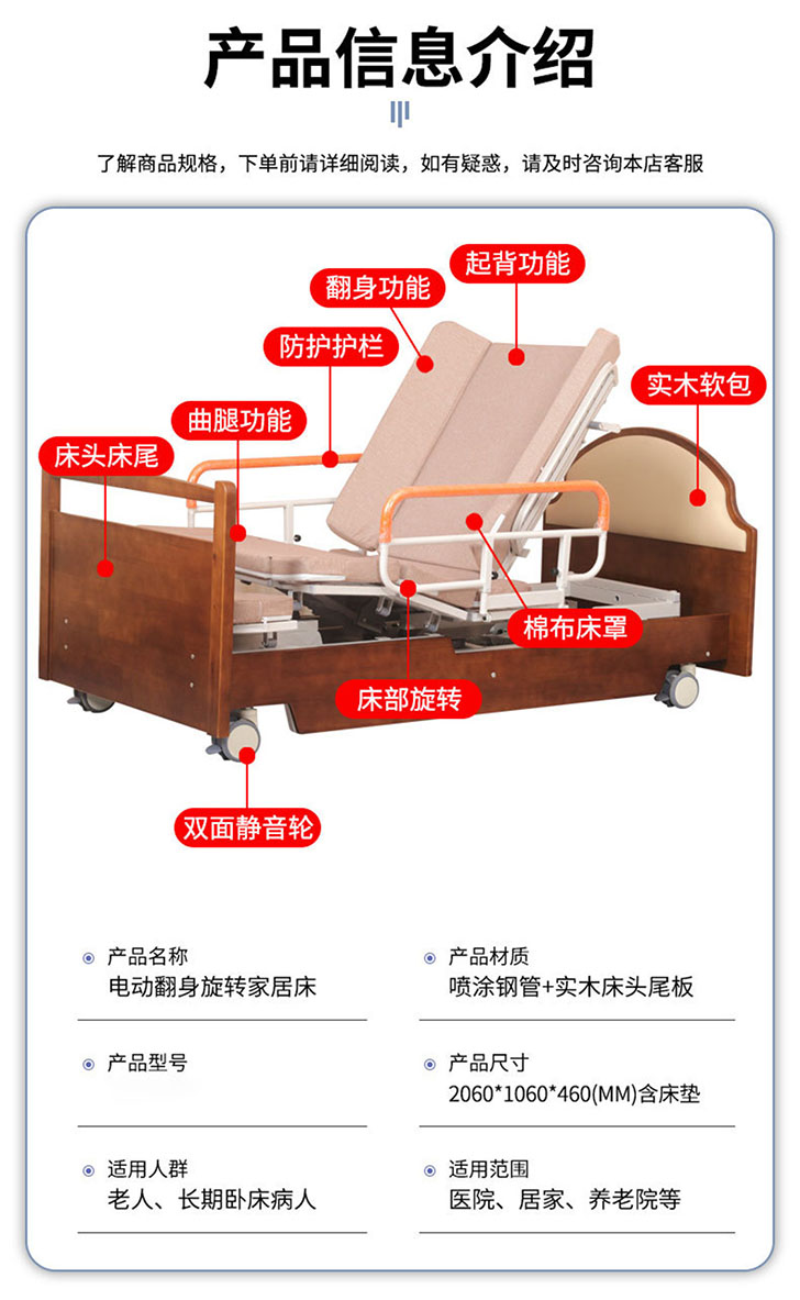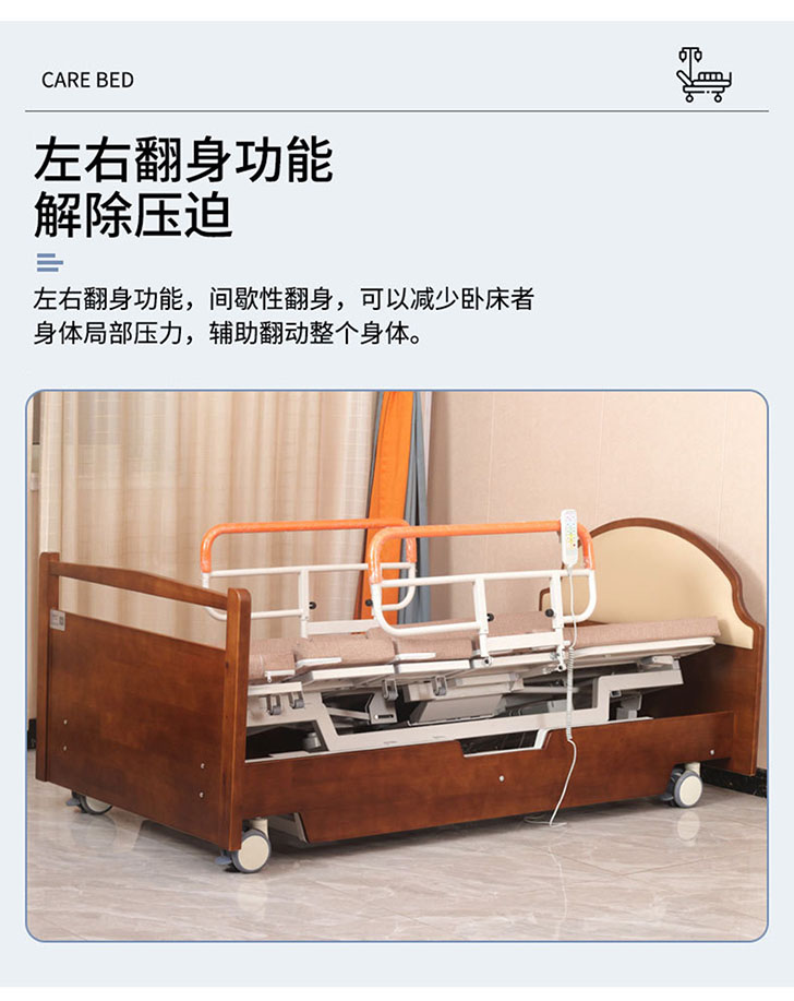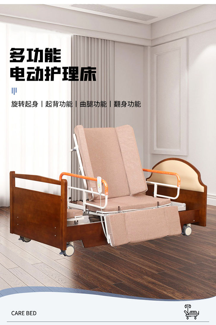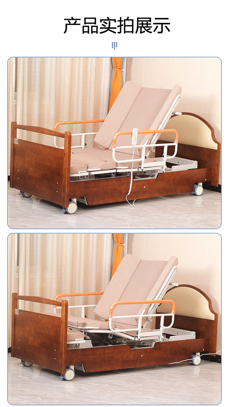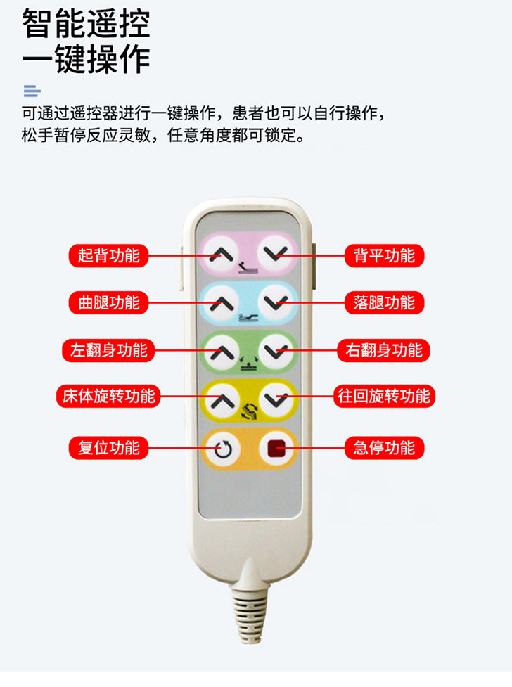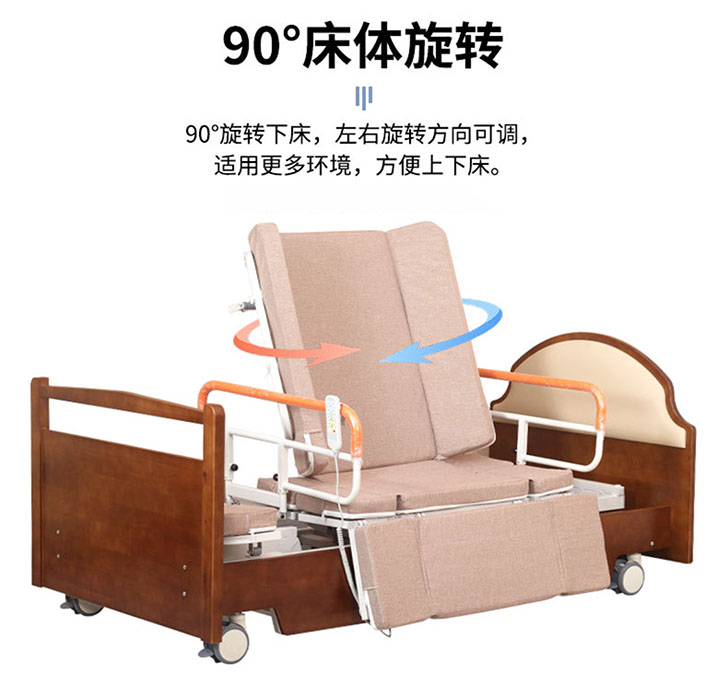 型號:YHF-HLC-B 抬腿功能:0-30°;起背功能:0-80°;旋轉角度:0-90° 操作方式:遙控;材質:碳鋼、加厚海綿墊 尺寸:2000 × 1000 × 430mm(可定制) 特色:電動升降旋轉床,抬腿操作可靈活伸展雙腿,抬背模式輕鬆輔助起身,旋轉功能實現多角度轉換,一站式解決護理難題